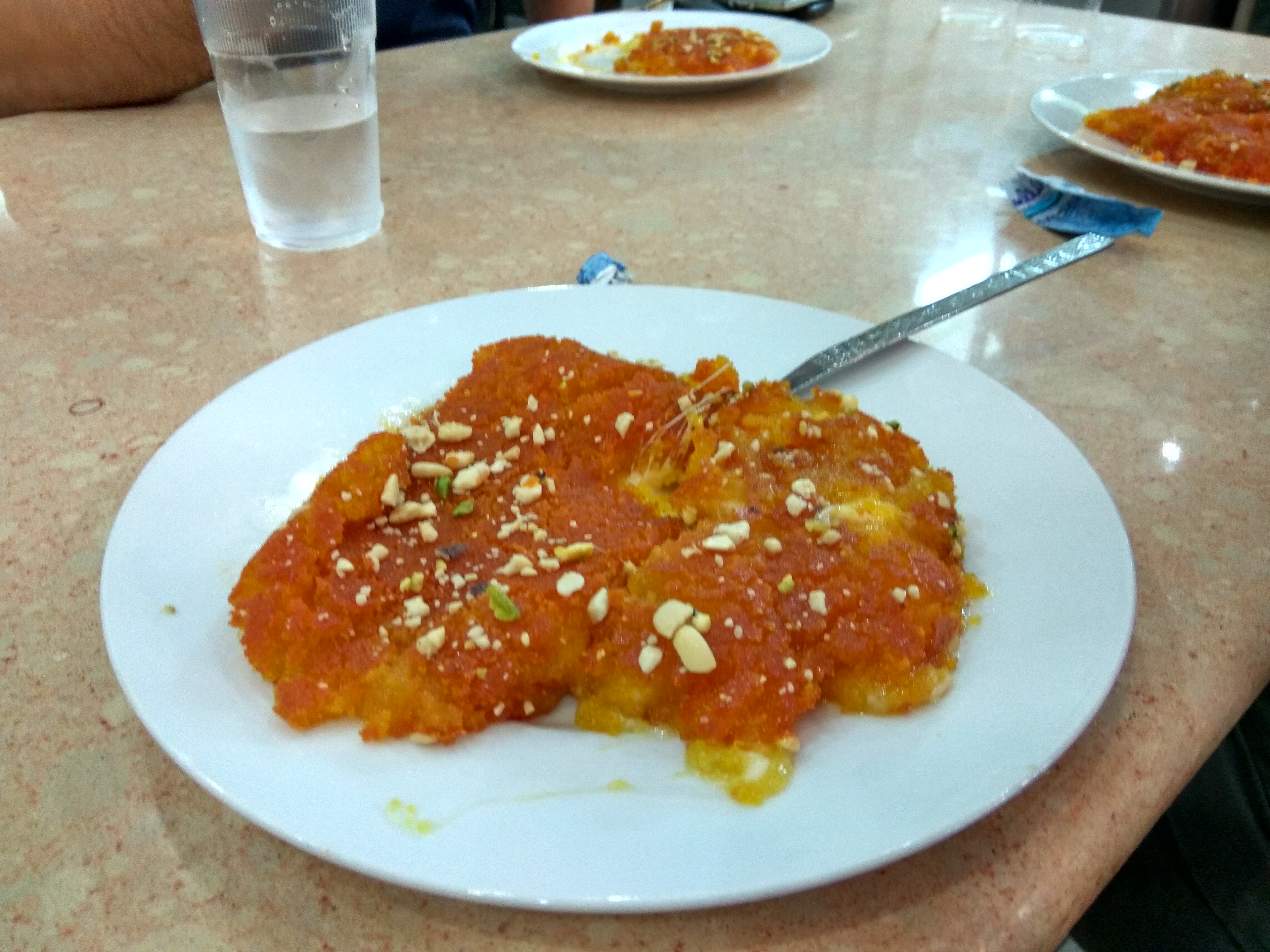 And so I got my Kanafeh! In short: it’s a devastating sugar and calory bomb (how it can be a local specialty from such a hot climate, is just another paradox of this region). A base of soft white cheese is topped with pastry and heated in butter or margarine. It is then sprinkled with fried crumbs, almonds or pistachios, and coated with a sugar syrup infused with aromas like rose water or orange blossom.