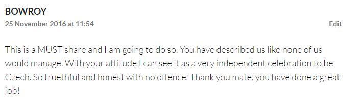 2. The thing about us Czechs you have to understand is that we in general love to make fun of each other and of our stereotypes and we love it even when someone “foreign” does it too, but he mustn’t be rude or riddiculing us, which you didn’t. Instead, you wrote satirically and ironically, which is the type of humor most of us Czech love and use, all you have to do is look at our most popular films ;)