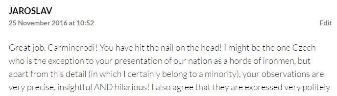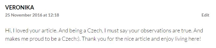 And I hit a nerve apparently: a lot of people commented expressing their “sense of pride” and somehow that made me think of a latent, offended dignity. Turns out that Czechs don’t mind some criticism, but also like to read a few nice things about them. Just like everybody else.