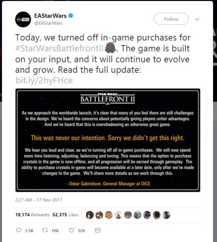 At that point, EA had to do something. And they reacted with an historical announcement saying that the micro-transactions were “temporarily removed” from the game.