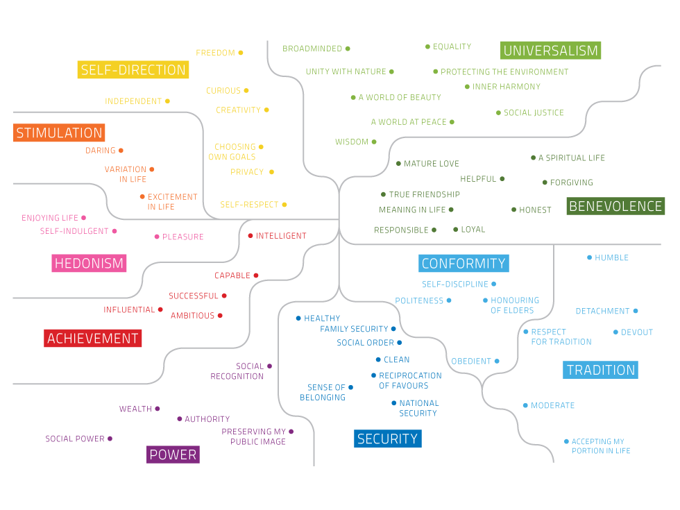 Some values are adjacent, which means they support each other; others are in opposition, and they follow a “seesaw effect”. This means that if one goes up, the opposing ones will go down. Like in a playground.