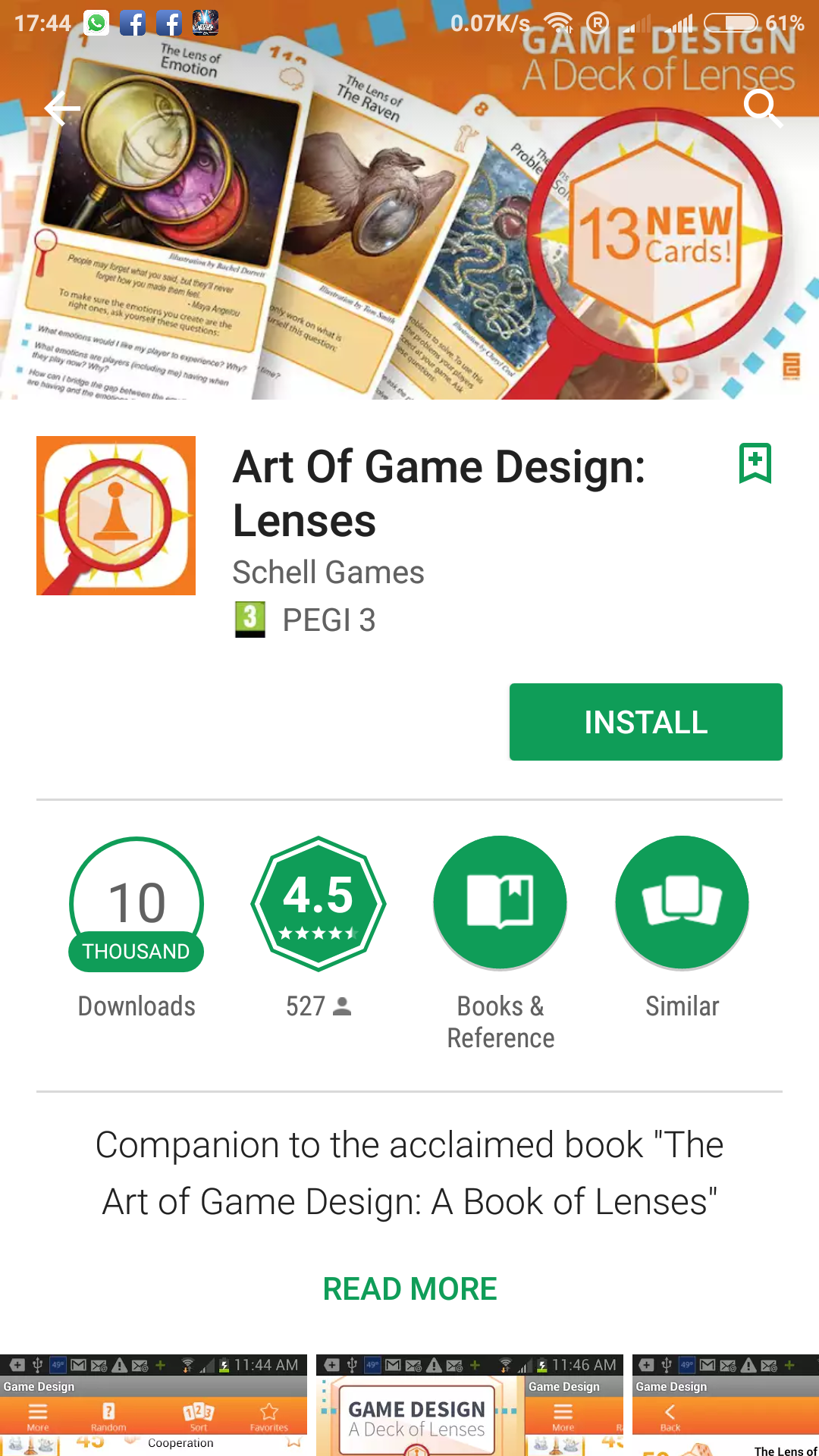 The book is also intended as a multimedia product. It has a companion “Deck of 100 Lenses” (think of it as a deck of cards card) through which to examine a game, that comes in the format of a free smartphone app, which not only sounds like an interesting concept, but also looks great and fun to use: