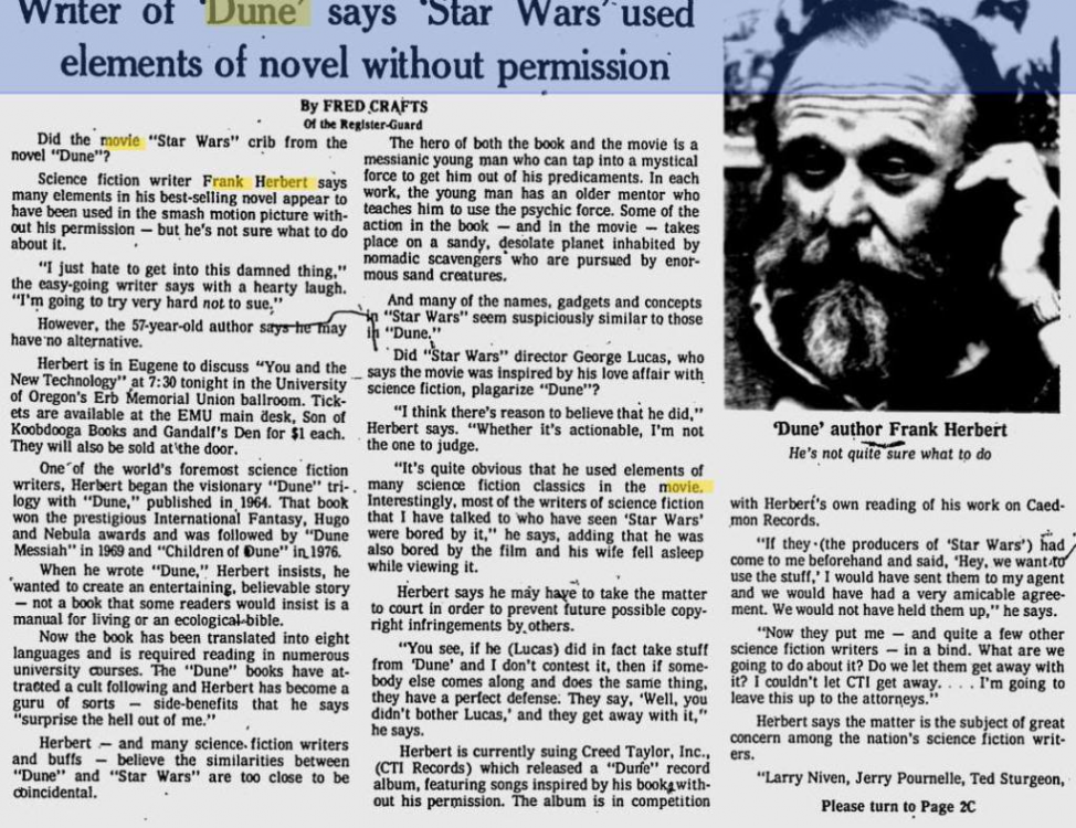 Herbert himself said “I am going to try very hard not to sue”. You can see the original article here. In the end, he didn’t, and together with other authors (allegedly) ripped off by Star Wars, he founded a mock society called “We are too big to sue George Lucas”. That’s class in my book.