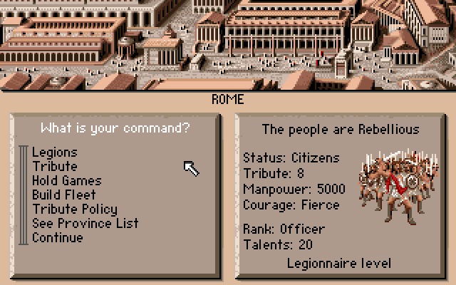 Centurion: Defender of Rome is a turn-based strategy game. You start with one province, Rome, and one legion.