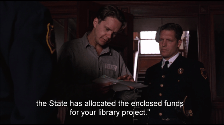 At the first opportunity, Andy puts his words in practice. When he receives news that his grant request to expand the library has been approved, he wants to offer a little celebration to all the inmates.