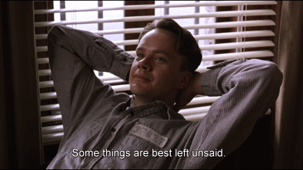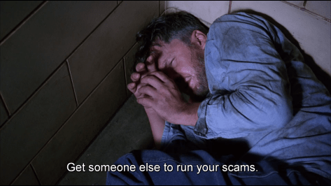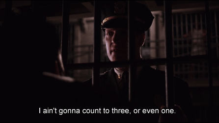 “There’s not a day goes by I don’t feel regret. Not because I’m in here, or because you think I should. I look back on the way I was then, a young, stupid kid who committed that terrible crime. I want to talk to him. I want to try to talk some sense to him, tell him the way things are, but I can’t. That kid’s long gone and this old man is all that’s left. I got to live with that. Rehabilitated? It’s just a bullshit word. So you go on and stamp your forms, sonny, and stop wasting my time. Because to tell you the truth, I don’t give a shit”.