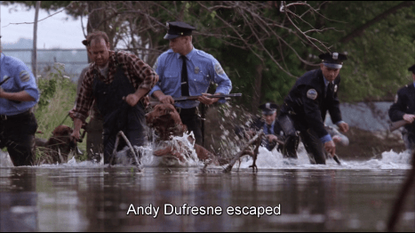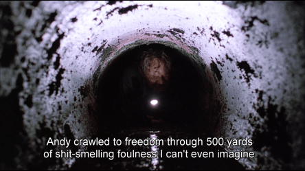 It took him almost 20 years, but Andy Dufresne managed to escape the Shawshank penitentiary, and by crawling through those narrow tunnels (a clear symbol of Death and Rebirth) he crosses a new threshold and goes back Outside.