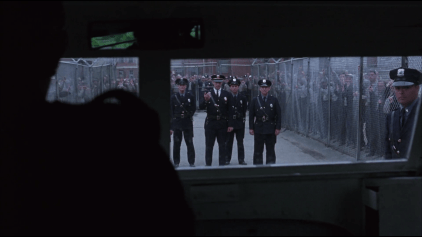 Crossing the Threshold: entering Shawshank. The movie takes its time to make the audience feel how heavy the transition feels. The armored van comes in; sets of heavy gates open and close one after another;