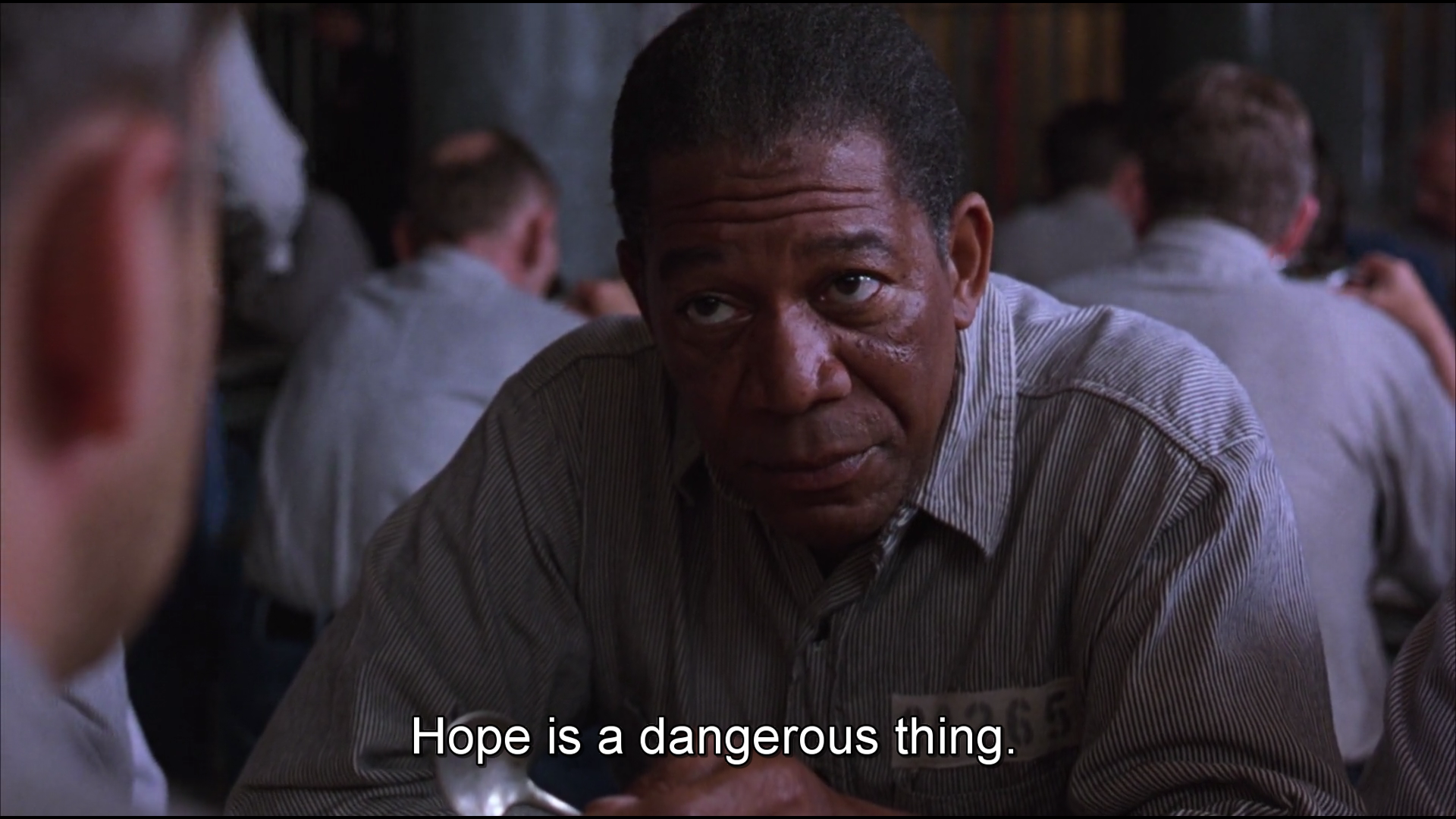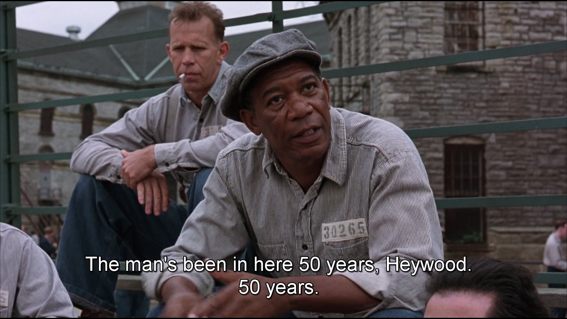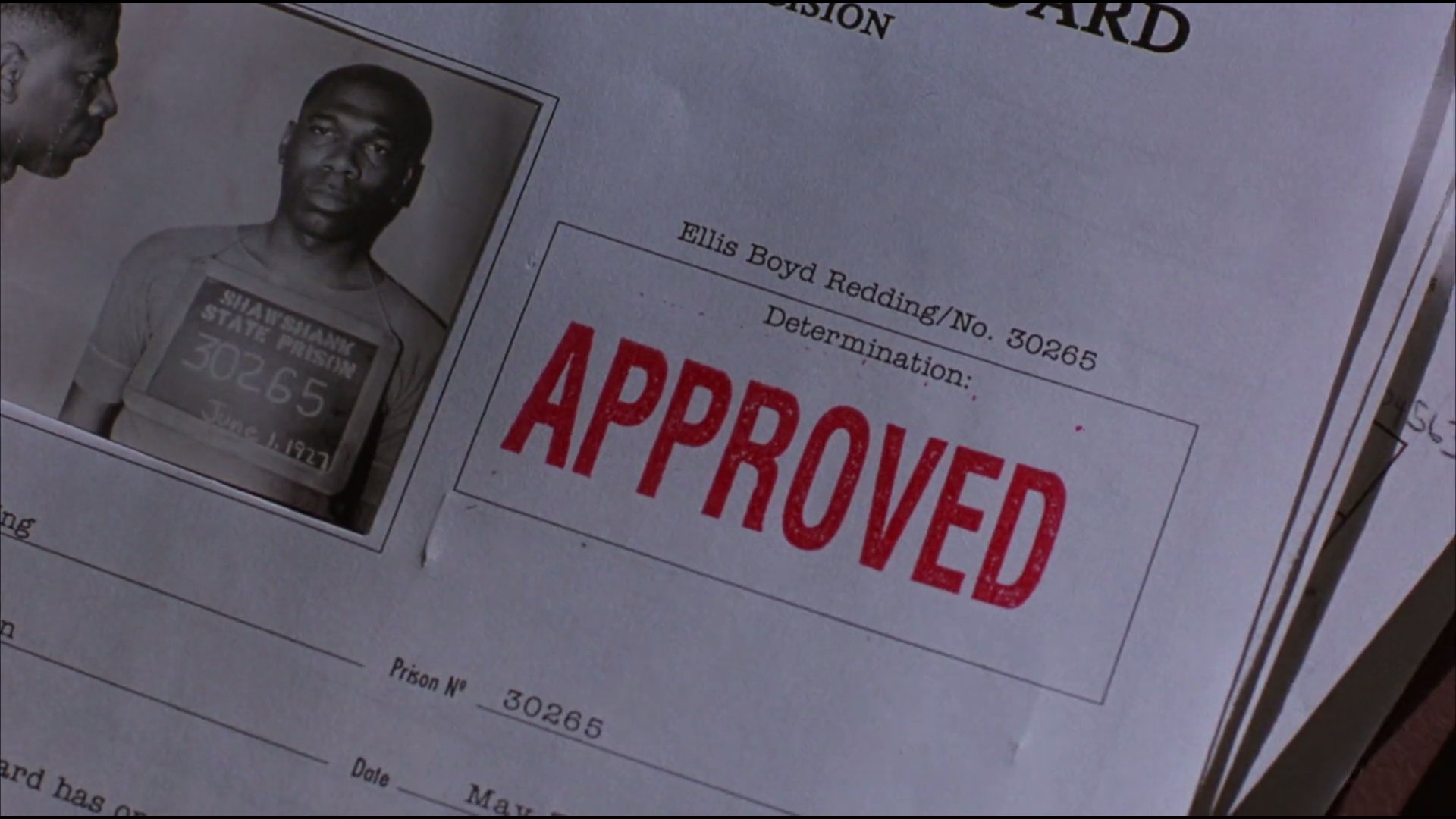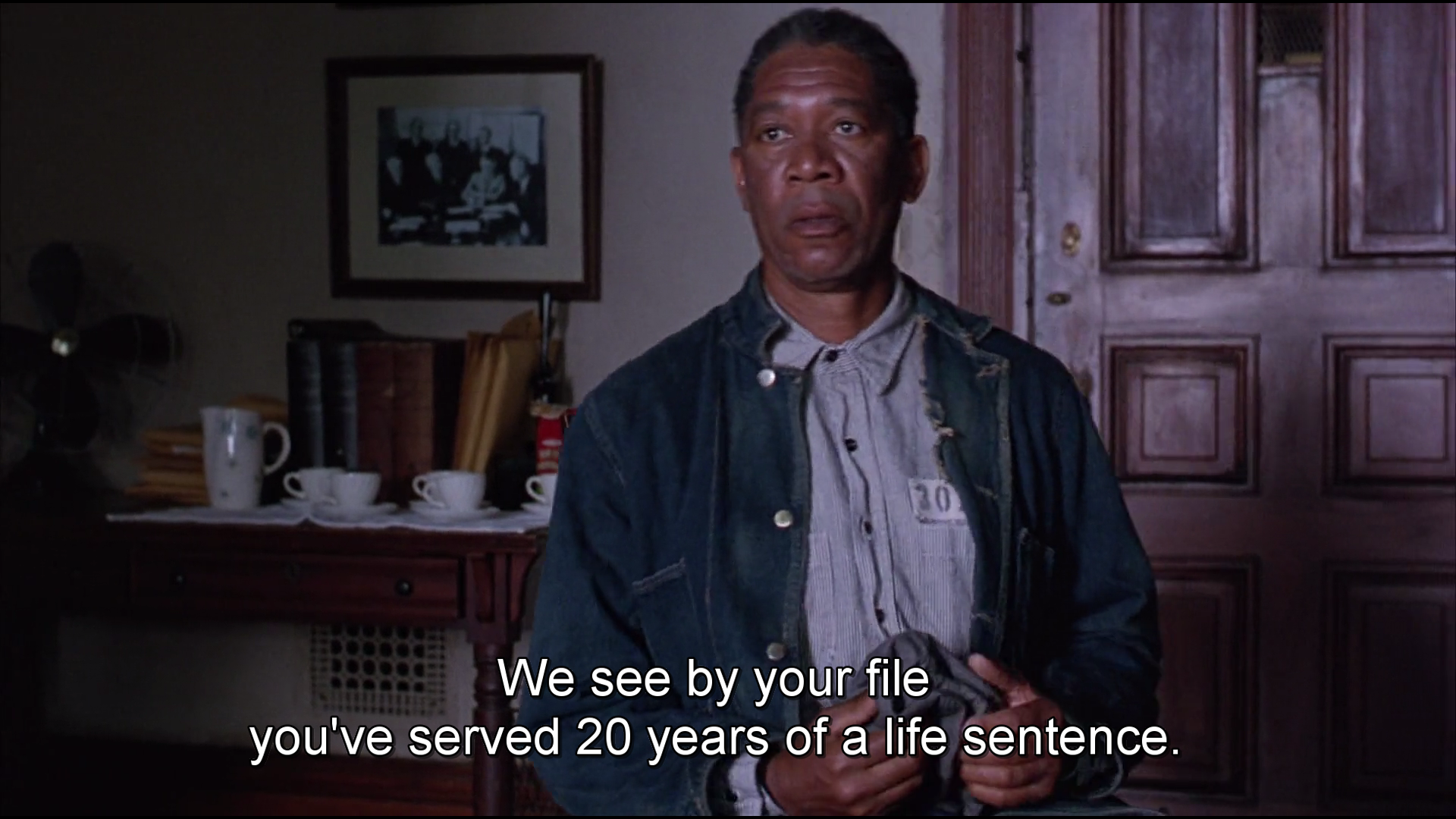 Right after, the scene moves to the Shawshank penitentiary. Inside, Red (Morgan Freeman) has been serving 20 years and is being interviewed for parole.