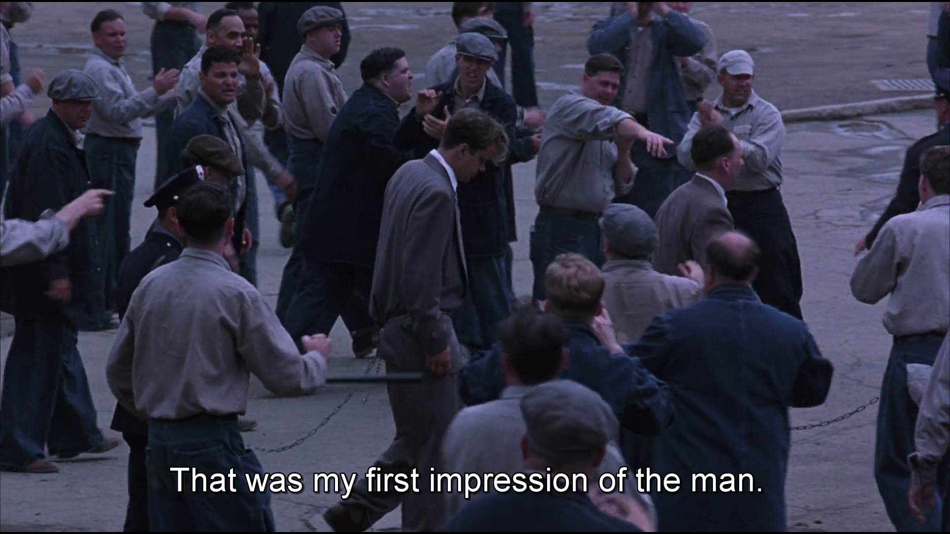 Crossing the Threshold: entering Shawshank. The movie takes its time to make the audience feel how heavy the transition feels. The armored van comes in; sets of heavy gates open and close one after another;