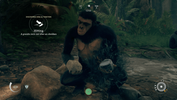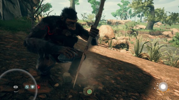 Probably the most fascinating concept in the game is how evolution is represented. Everything your hominids do becomes acquired experience, meaning that the specific member you are controlling becomes better at doing that specific action: anything, from recognizing the familiar smell of a mango tree, to communicating with your clan, to catching a fish in the right spot using a pointy stick.