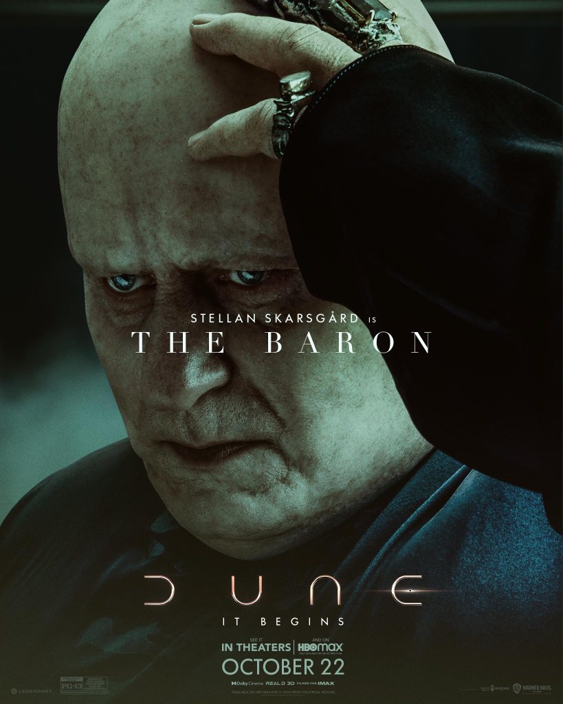 I like Chalamet’s Paul. I love Oscar Isaac’s Duke. Jason Momoa as Duncan is, well, Jason Momoa and Josh Brolin brings a Thanos element to Gurney Halleck which, to be honest, at times felt too granitic. I will stick to Patrick Stewart’s version, more versatile and able to better catch the complexity of the space troubadour-master of arms. Lady Jessica (played by Rebecca Ferguson) is very convincing even though she gets to do a lot of exposition, some of which felt redundant; while Chani (Zendaya) comes out as a strong-willed and untamed desert daughter. Javier Bardem surprised me as a perfect Stilgar, intense and conscious of his role. This is no planet for old men. Last mention of honor for Stellan Skarsgård, who completely steals the scene as the Baron Harkonnen every single time and creates a villain memorable as few others. Scheming, ruthless, greedy. Less than human or maybe, beyond human. Quintessential evil.