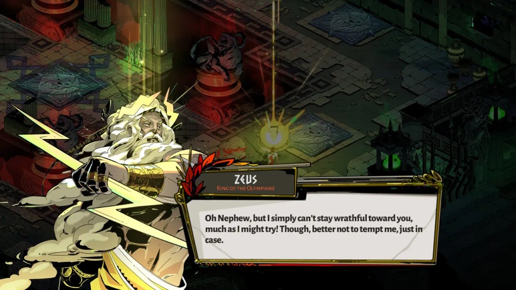 In this case the smart twist comes from the fact that the Prince of the Underworld… cannot really die, right? So every time he is slain by his enemies, he just re-emerges from the underground rivers directly in his home. The worst part will be having to hear his father’s nagging, one more time.