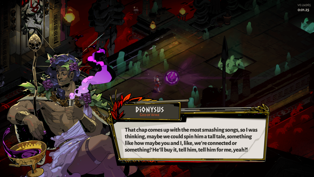 and of course meet so many Gods of the Olympus, constantly wrestling for power and entertainment as they bestow their favors (or their wrath) upon the protagonist. Dionysus, the god of wine (and good times) is probably one of my favorites.